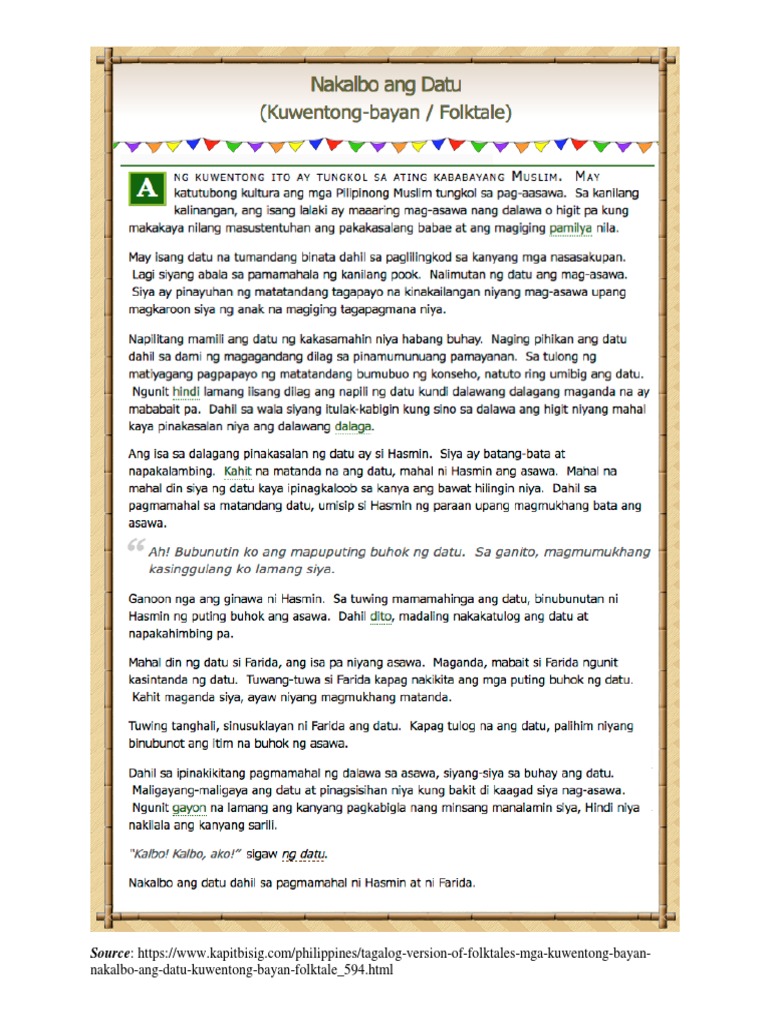 For educational purposes onlyAll credits goes to the rightful owners. Ilarawan ang banghay ng nakalbo ang datu. Ang kuwentong ito ay tungkol sa ating kababayang Muslim.