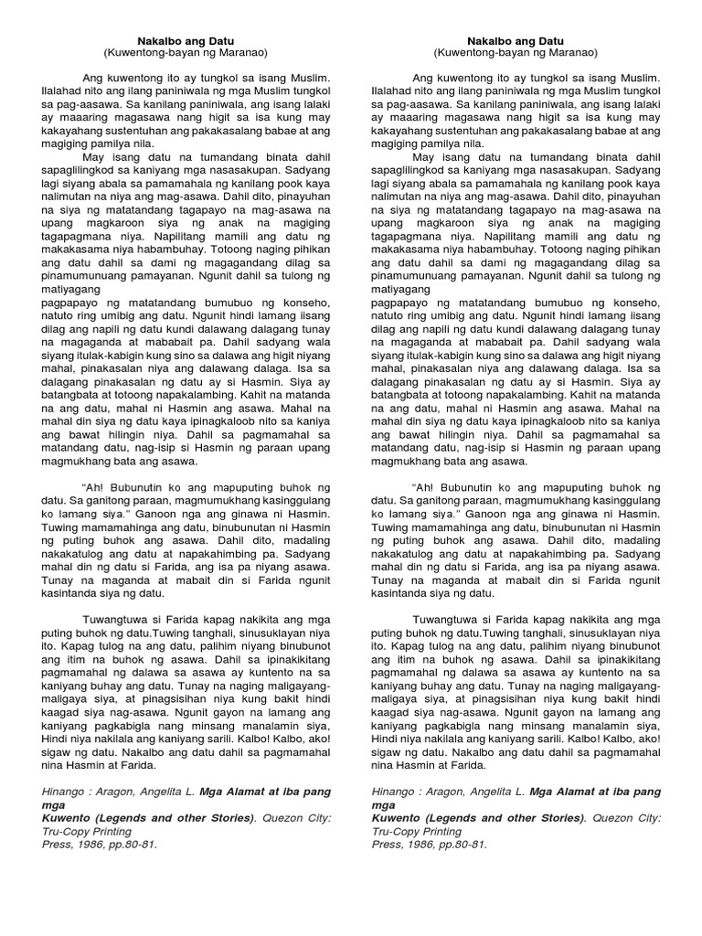 Nakalbo ang Datu Kuwentong-bayan Folktale Ang kuwentong ito ay tungkol sa ating kababayang Muslim. Ito ay isa sa mga kuwentong-bayan ng ating mga kapatid na Muslim sa Pilipinas. KUWENTONG BAYAN GRADE 7- FILIPINO.