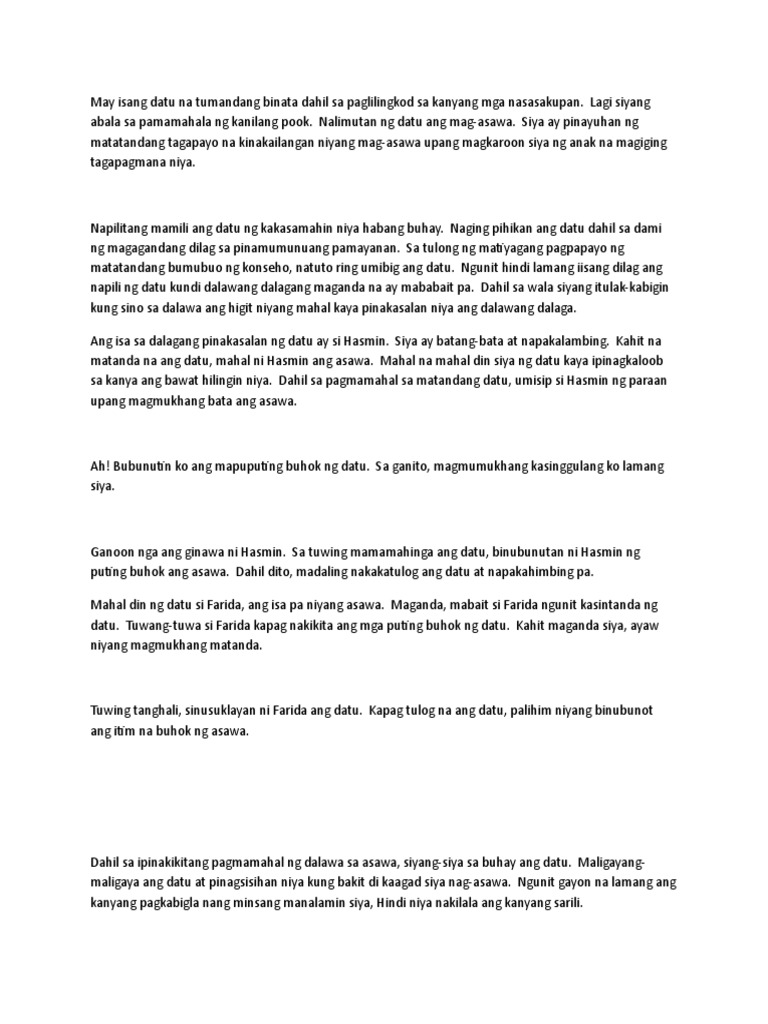 Isa sa pinakamahalagang kailangan nating malaman ay kung bakit at paano nga ba nakalbo ang datu. Ngunit gayon na lamang ang kanyang pagkabigla nang minsang manalamin siya Hindi niya nakilala ang. Mayroong tradisyunal na kultura ang mga Muslim sa pag-aasawa.