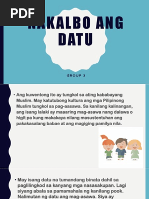 Nakalbo ang Datu Kuwentong-bayan Folktale Ang kuwentong ito ay tungkol sa ating kababayang Muslim. Datu at ang kanyang konseho ng mga tagapayo. Siya ay pinayuhan ng matatandang tagapayo na kinakailangan niyang mag-asawa upang magkaroon siya ng anak na magiging tagapagmana niya.